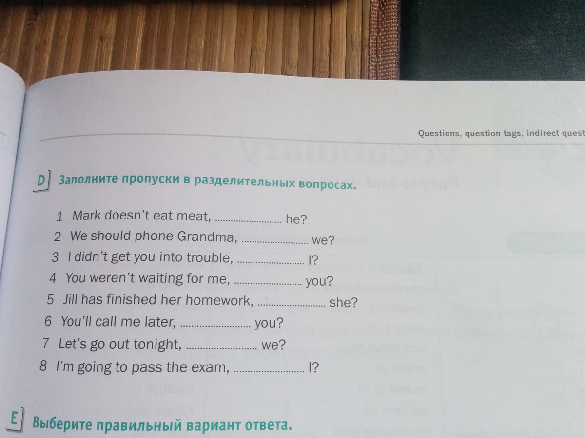 Заполните пропуски в разделительных вопросах в (D), а в (E) выберите правильный вариант ответа СРОЧНО!!!