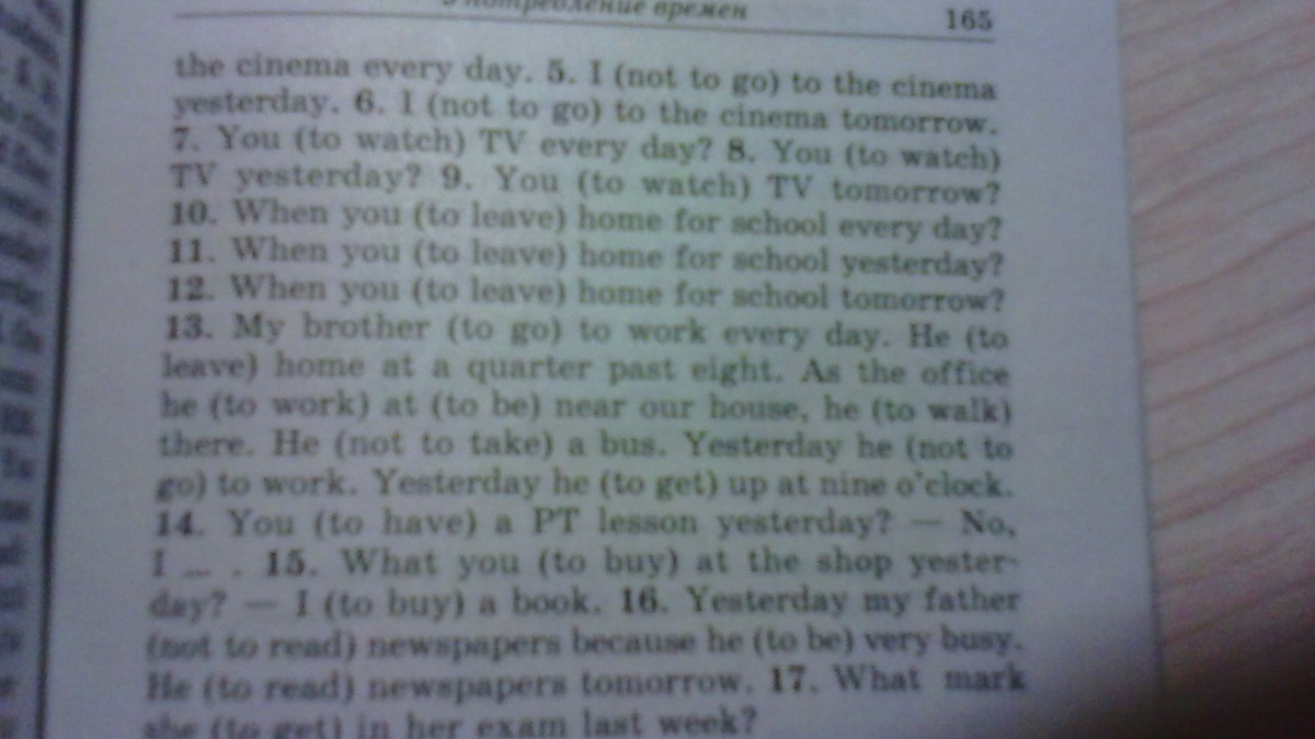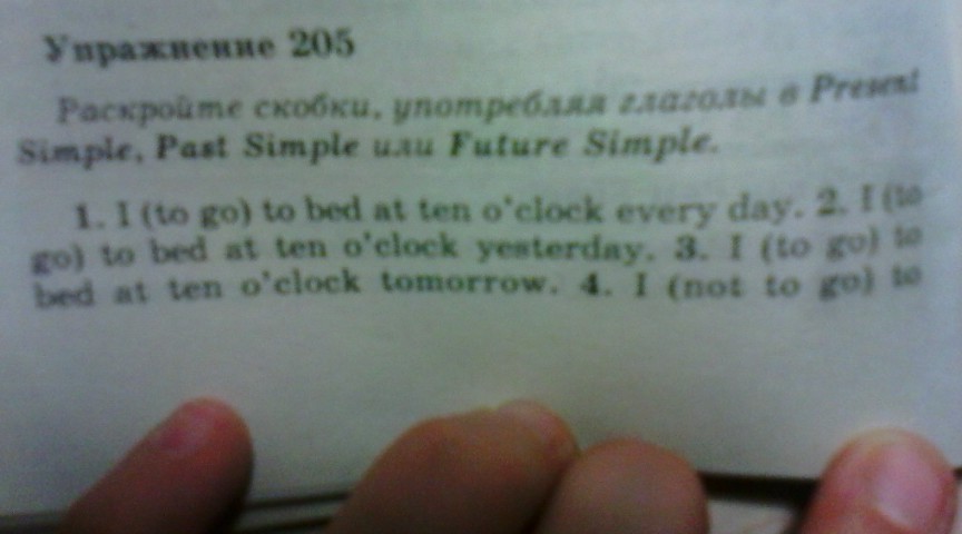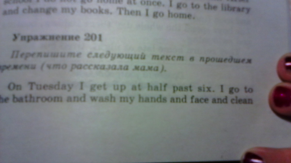 Во вторник я встаю в 06:30 .Я иду в ванну мою мои руки и умываю лицо и чищу зубы.Я иду в кровать в 10 часов каждый день.Я ложился спать-(иду в кровать) в 10 часов вчера.Я пойду в кровать в 10 часов завтра.Я не пойду смотреть кино каждый день. Фуф ...... дальше не смогу =( увы :(