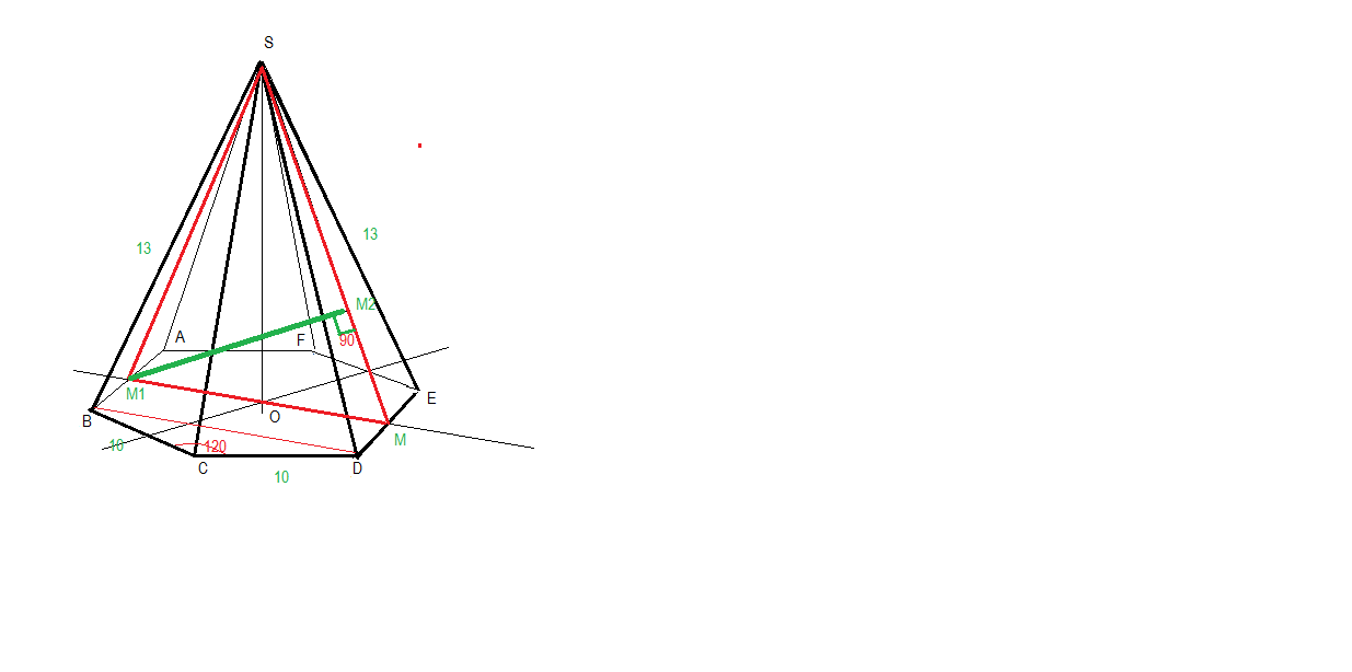 В правильной шестиугольной пирамиде SABCDEF со стороной основания 10см и боковым ребром 13см. Найдите расстояние и угол между прямыми SM и AB, где M середина CD