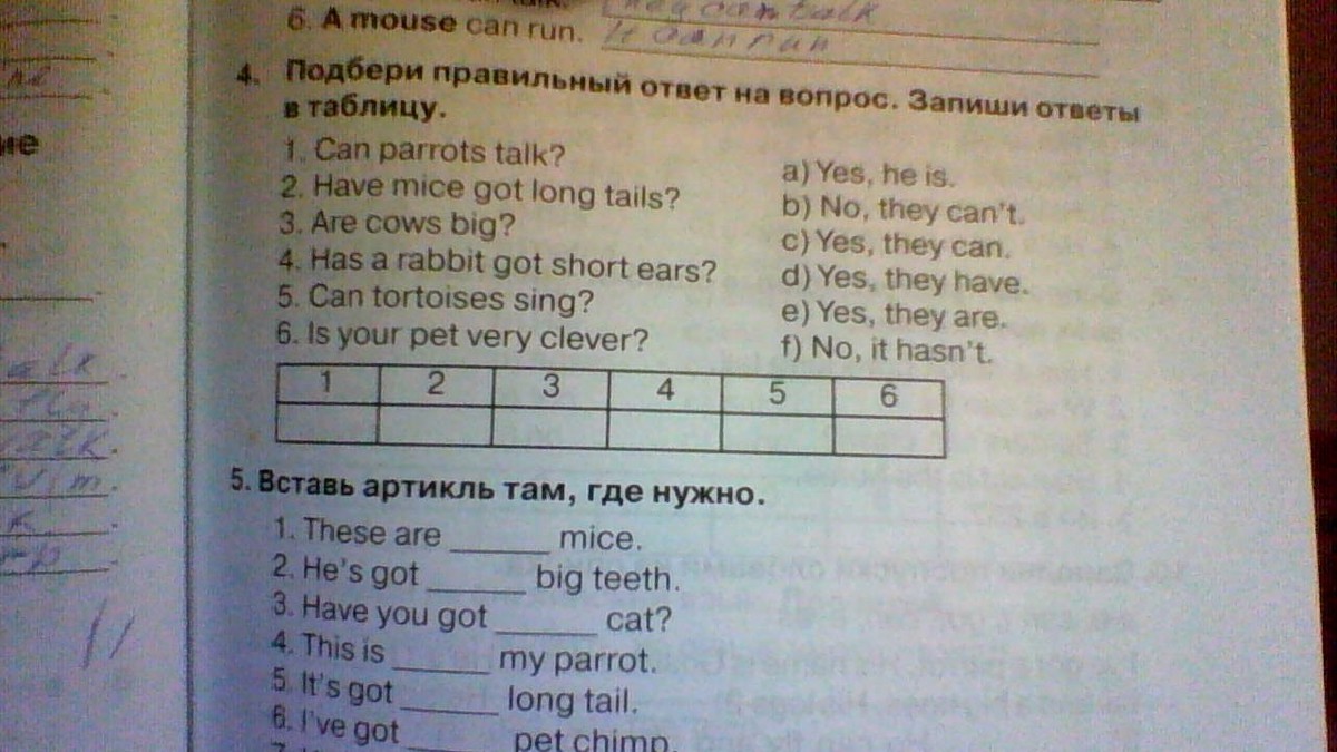 1.Can parrots talk? 2.Have mice got long tails? 3.Are cows big? 4.Has a rabbit got short ears? 5.Can tortoise sing? 6.Is your pet very clever?