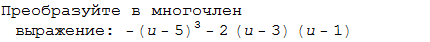 -(и-5)³-2(и-3)(и-1)= - (и³ - 15и² + 75и -125) -2(и²-и-3и+3)= - и³ +15и² - 75и +125 -2(и²-4и+3)= - и³ +15и² - 75и +125 -2и²+8и-6= - и³ + 13и² -67и +119