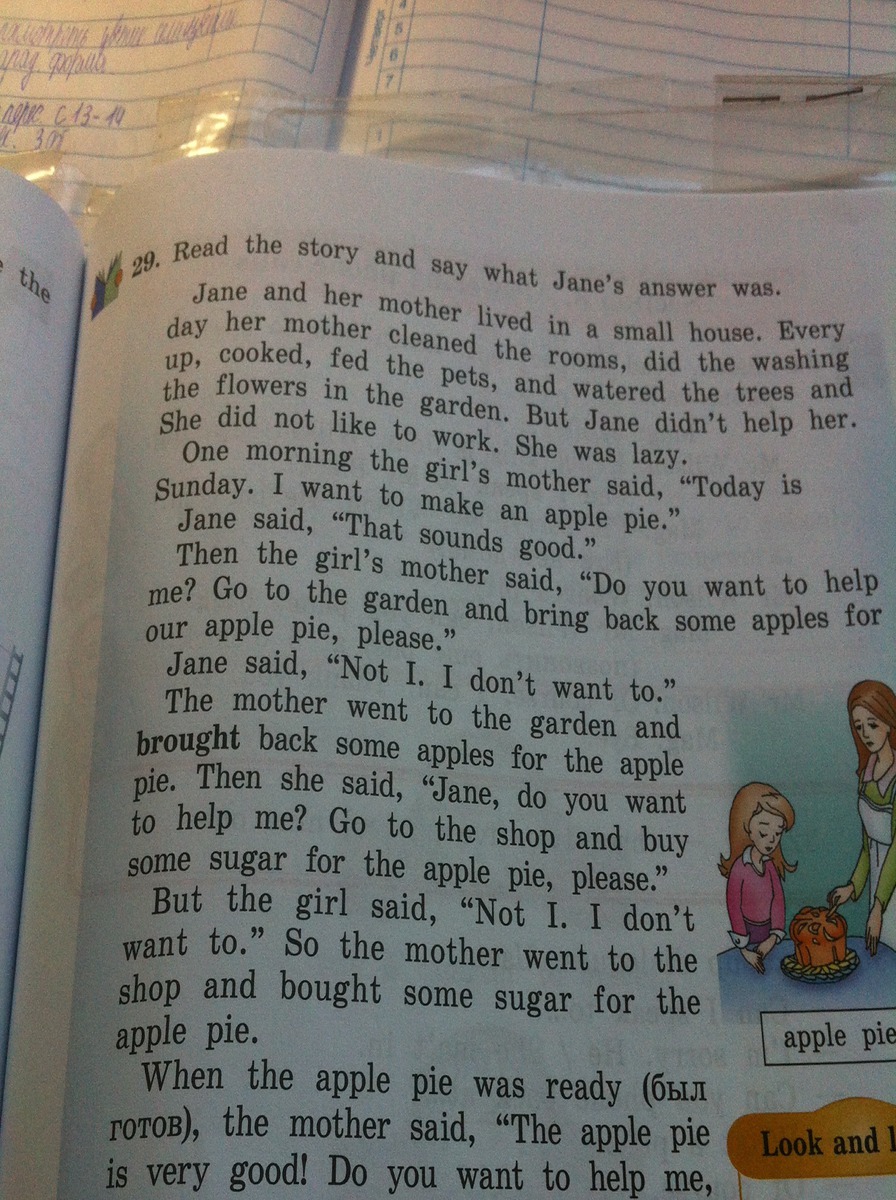 Читайте историю и сказать, что Джейн ответ Джейн и ее мать жила в маленьком домике. Каждый ее мать убирала номера, сделал промывку до, приготовленный, кормили цветы в саду. и поливать деревья и ей не нравится работать. Она была ленивый. Но Джейн не помочь ей Однажды утром мать девочки говорит: «Сегодня воскресенье. Я хочу сделать яблочный пирог." Джейн сказала, "Это звучит хорошо." Тогда мать девушки сказала, "Вы хотите, чтобы помочь мне? Перейти в саду и вернуть некоторые яблоки для нашей яблочный пирог, пожалуйста." Джейн сказала, "Не я, я не хочу". Мать пошла в сад и принес несколько яблок для яблочного IE. Тогда она сказала, "Джейн, вы хотите, чтобы помочь мне? Перейти в магазин и купить немного сахара для яблочного пирога, пожалуйста. Но девушка сказала, "Не я, я не хочу". Так мать пошла в магазин и купила немного сахара для яблочного пирога. Когда яблочный пирог был готов 6HI roroB), мать сказала: "яблочный пирог очень хорошо! Хотите, чтобы помочь мне..