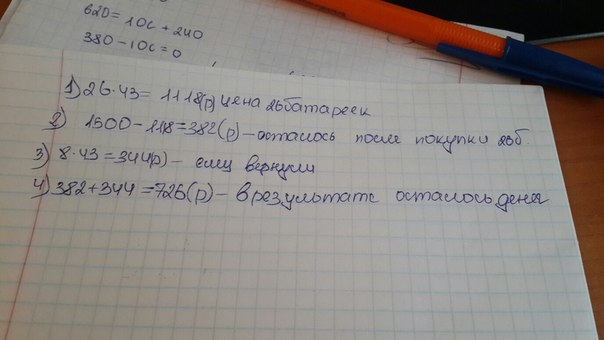 У Алёши было 1500 руб.Он купил 26 батареек по 43 руб.,а затем вернул в магазин 8 неисправных батареек и получил за них деньги. Сколько в результате у него осталось денег?