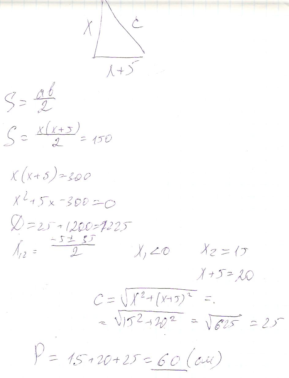 один катет прямоугольного треугольника больше другого на 5 см.найдите периметр этого треугольника если его площадь равна 150 см в квадрате
