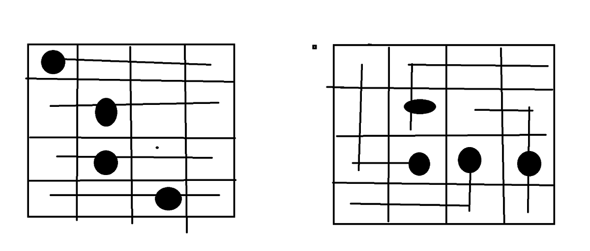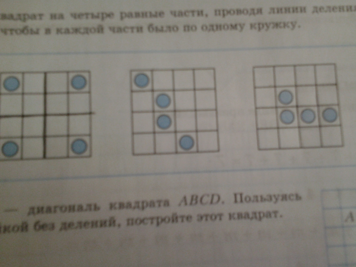 разделите квадрат на 4 равные части , проводя линии деления по сторонам клеток так, чтобы в каждой састи было по одному кпужку .