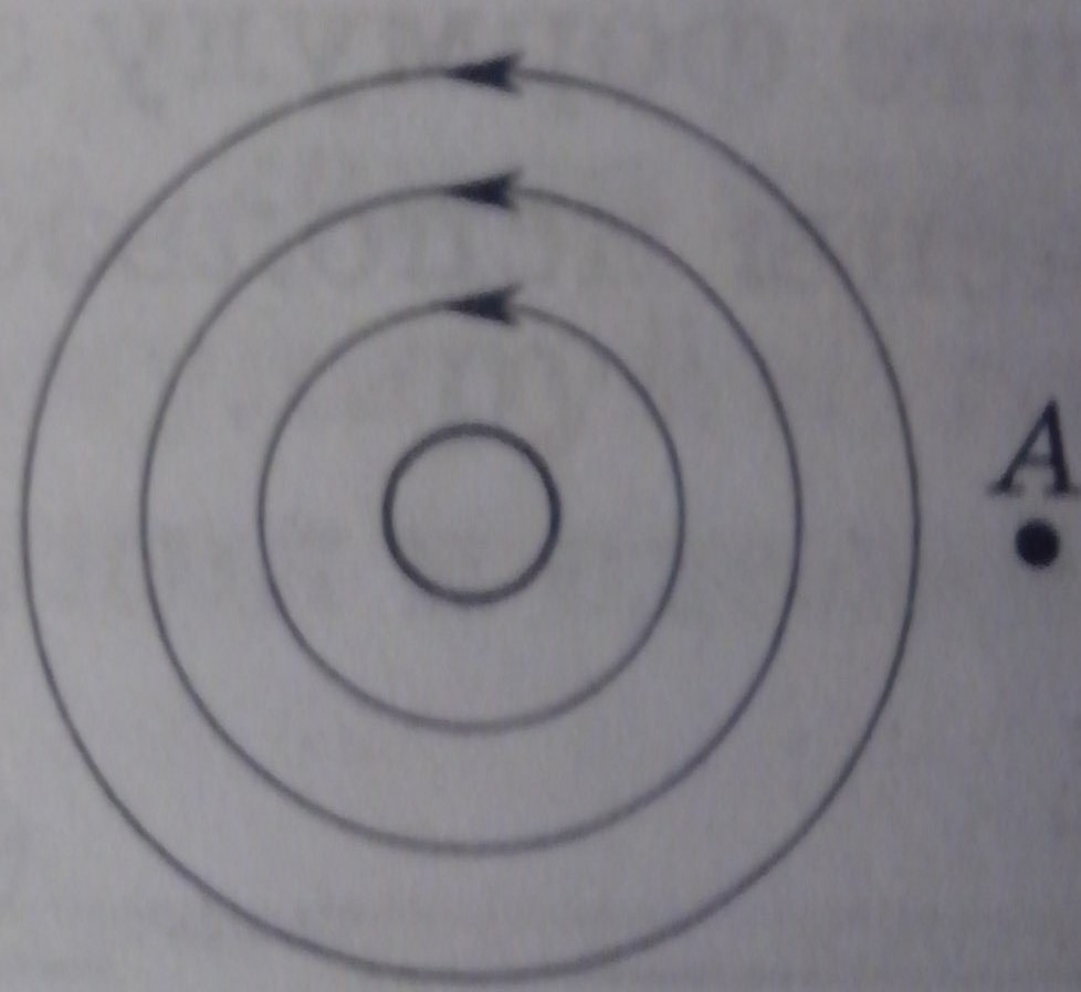 На рисунке показаны линии магнитной индукции магнитного поля проводника с током. Определите направление тока в проводнике. Существует ли магнитное поле в точке А?