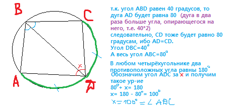 Дуга AD=CD,Угол ABD=40°.Найти угол ADC.