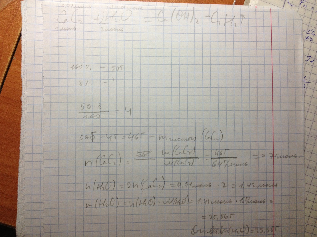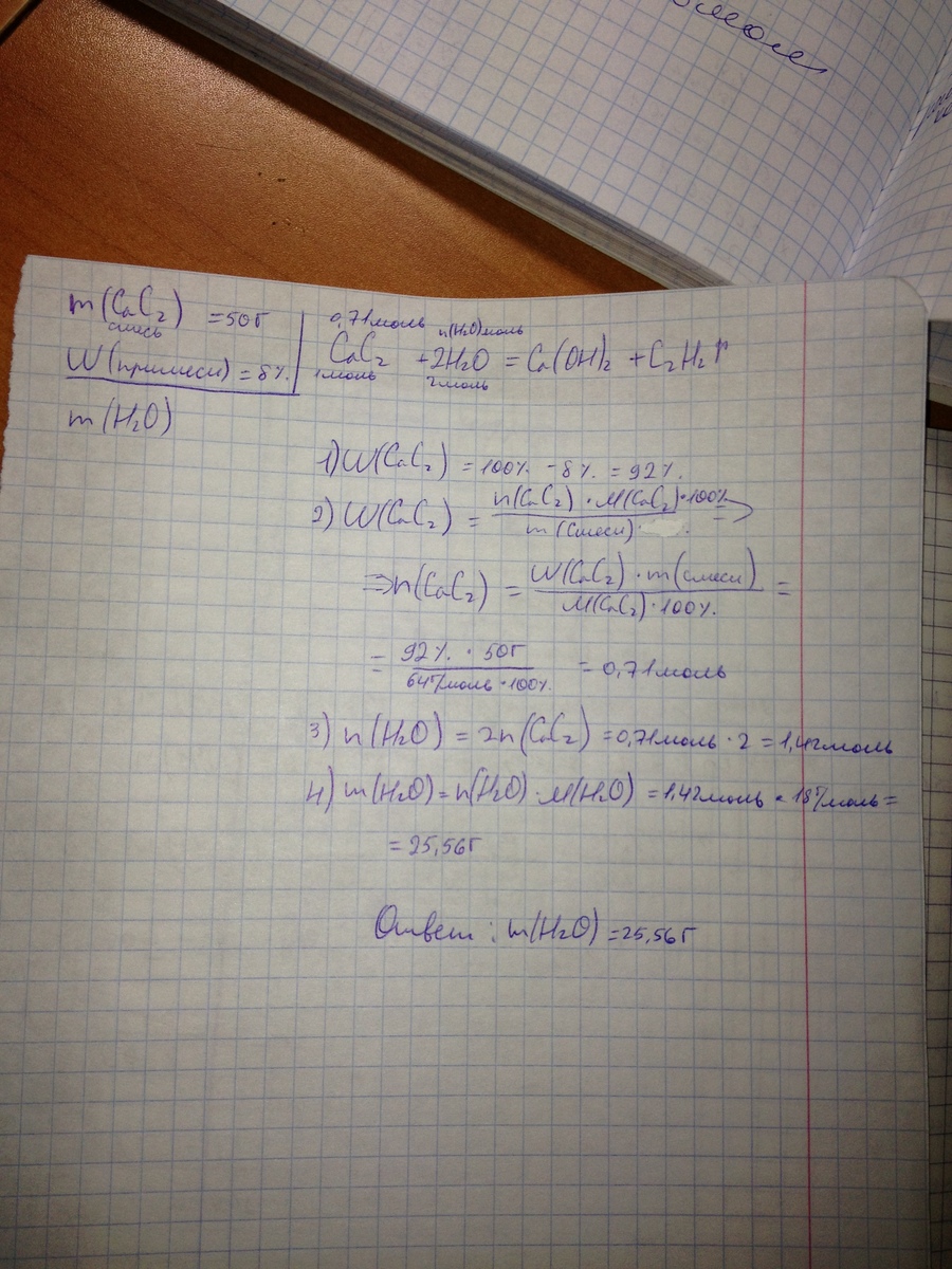 сколько граммов воды потребуется для реакции с 50 г технического карбида кальция, содержащего 8 % примесей?