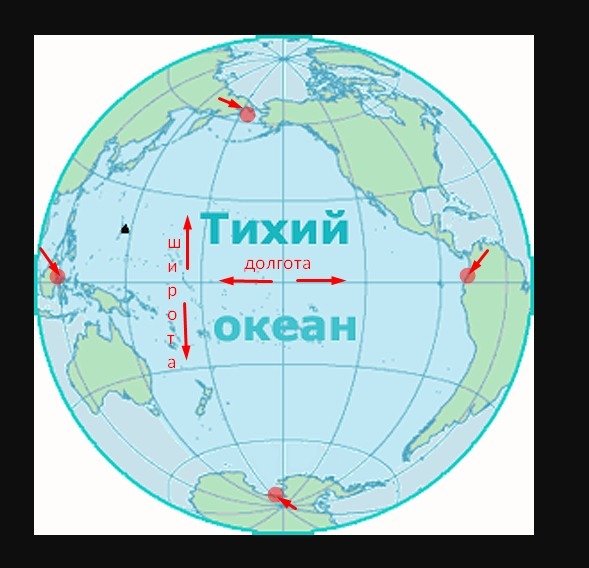 Определим широту и долготу Тихого океана,для этого необходимо найти границы акватории,определить крайние точки: