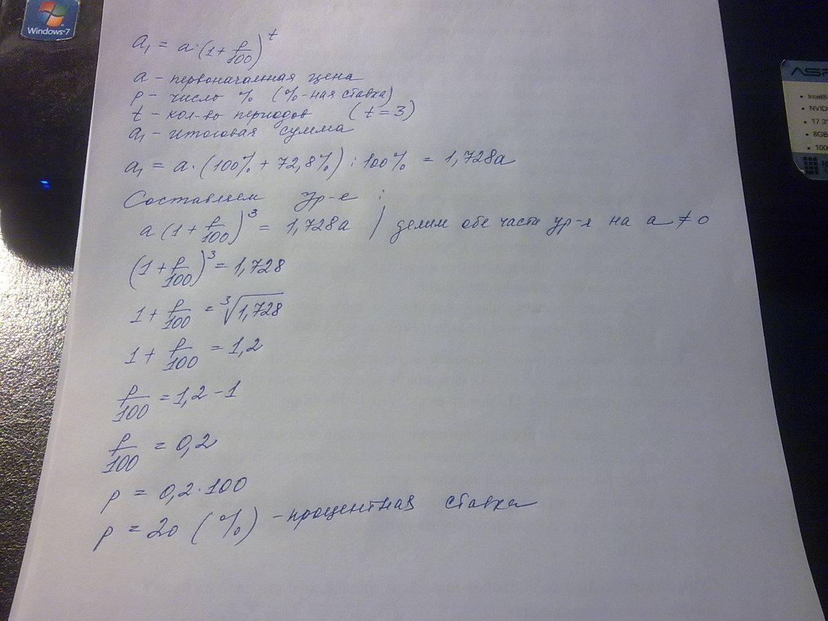 В результате трехкратного повышения цены на некоторый товар на одно и то же число процентов цена товара стала превышать первоначальную цену на 72.8% . На сколько процентов повышалась цена на товар каждый раз? Решите задачу, зная формулу сложного процента. (