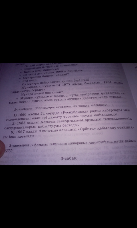 2)1965 жылы (кашан?пысыктауыш) Алматы телеорталыгы(не бастады?,бастауыш) орталык(кандай телевидиенин?аныктауыш) телевидиенин(ненин багдарламаларын?аныктауыш) кабылдауды бастады(курдели баяндауыш)жай сойлем,толымды,жакты,жайылма