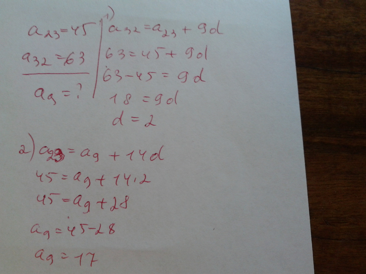пятница 13-е не везде считается самым несчастливым днем календаря. в греции и испаноязычных странах традиционно боятся выпадающего на 13-ое число вторника. а в италии-пятницы, но другого числа, ведь этого числа итальянцы опасаются гораздо больше , чем 13. возможное объяснение этому кроется еще в могилах древних римлян на которых были нередки надписи перевод которых означает я жил или моя жизнь кончена. запишите число чисо, которого боятся итальянцы, если оно является девятым членом арифмитической прогрессии, двадцать третий член, который равен 45, а тридцать второй член этой прогрессии равен 63.