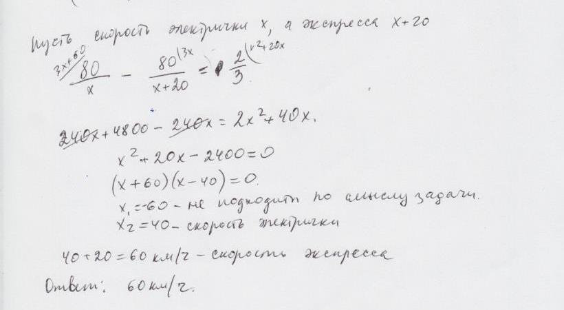 средняя скорость обычной электрички на 20 км/ч меньше,чем электрички Экспресс, поэтому из города А в город В, расстояние между которыми 80км , обычная электричка идёт на 40 минут дольше .Определите среднюю скорость ( в км/ч) электрички Экспресс. Помогите, пожалуйста