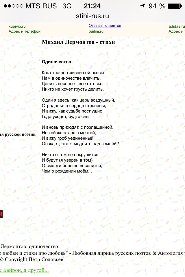 Чем о рождении моем...Конечно, многим подросткам знакомо такое ощущение, когда их не понимают окружающие, близкие, друзья, что вызывает у них глубочайшую депрессию. Тогда каждый ищет свое спасение: кто-то пишет музыку, кто-то стихи, кто-то ведет дневник. Но есть и такие, кто ищет смерти. Многие современники утверждали, что Лермонтов принадлежал именно к числу таких людей. Он много раз дрался на различных дуэлях, как будто искал возможности побыстрее уйти из жизни, что, в итоге, и осуществилось 15 июля 1841 года на дуэли с Мартыновым.