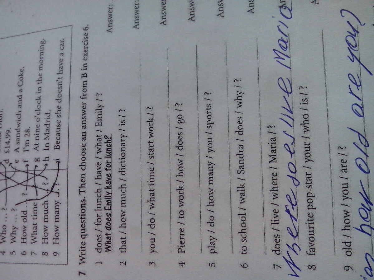 how much is that dictionary?what time do you start work?how does pierre go to work?how many sports do you play? why does sandra walk to school? where does marina live? who is your favourite pop-star? how old are you?