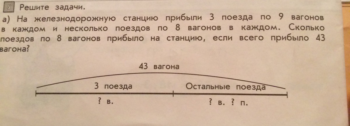 3*9=27 вагонов в 3-х поездах; 43-27=16 вагонов остаются; 16: 8= 2 поезда прибыло по 8 вагонов
