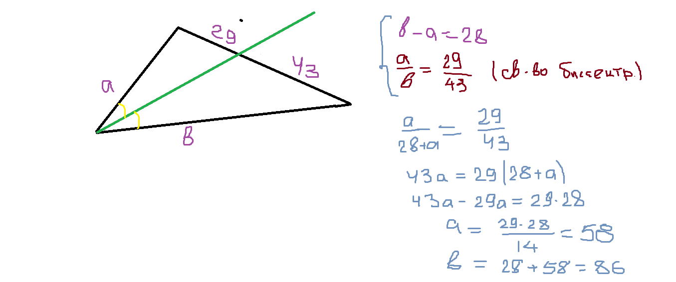 Найдите две стороны треугольника, если их разность равна 28 см, а биссектриса угла между ними делит третью сторону на отрезки 43 см и 29 см.