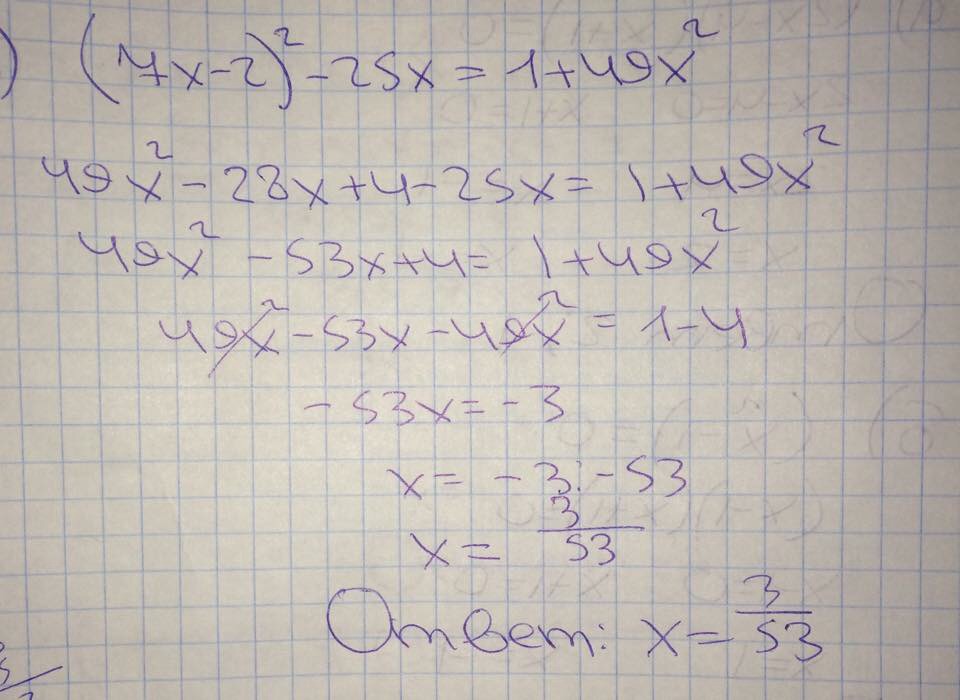 в) (7х-2)²-25х=1+49х²
