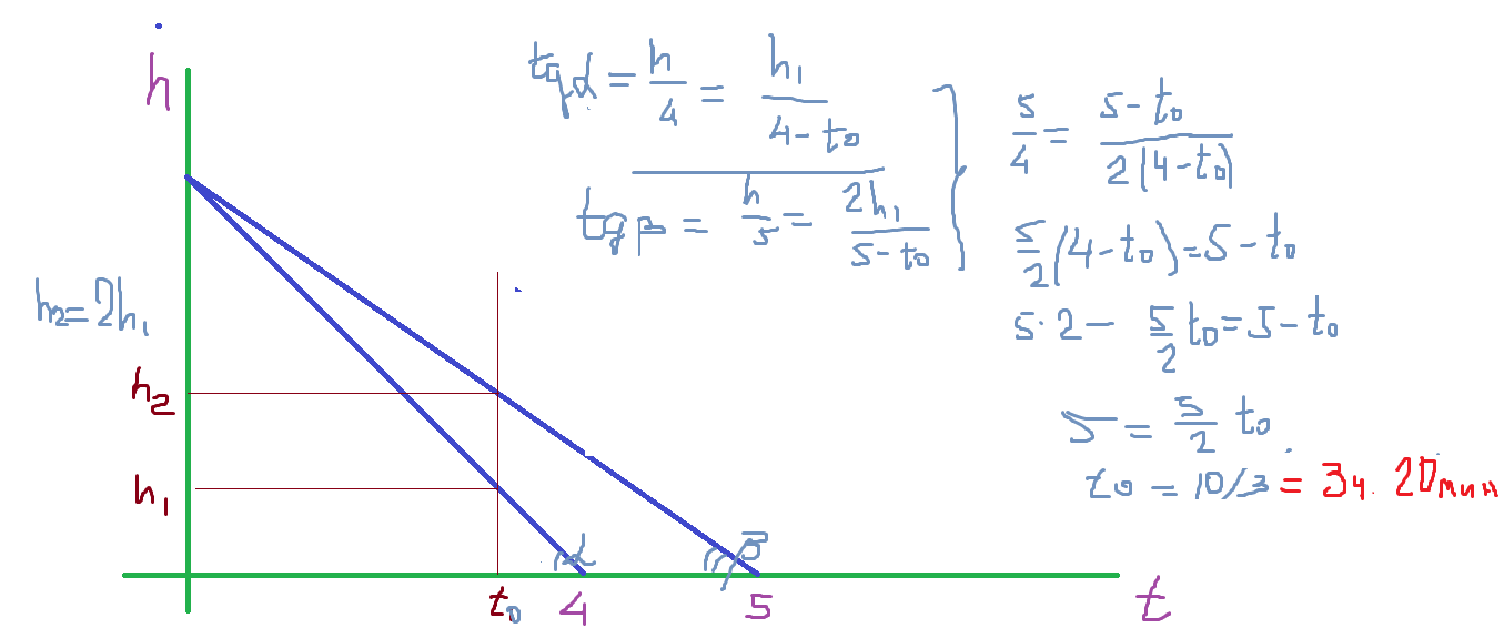 Дві свічки однакові за висотою . Одна свічка згорає за 4 год , а інша за 5 год. Свічки запалили одночасно . Через який час одна свічка стане вдвічі вищою за иншу а) через 3год 58 хв б) через 3 год в)через3год 20 хв г)через2год 40хв д)через2 год 30 хв (Надо срочно плиз!!!)