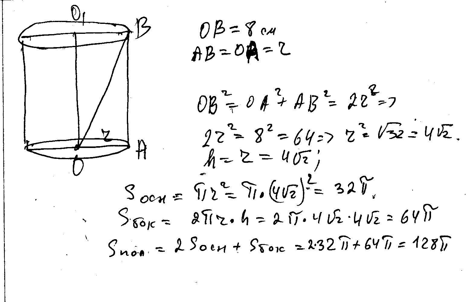 Осевое сечение цилиндра - квадрат,диагональ которого 8 см.Найдите площадь поверхности цилиндра.