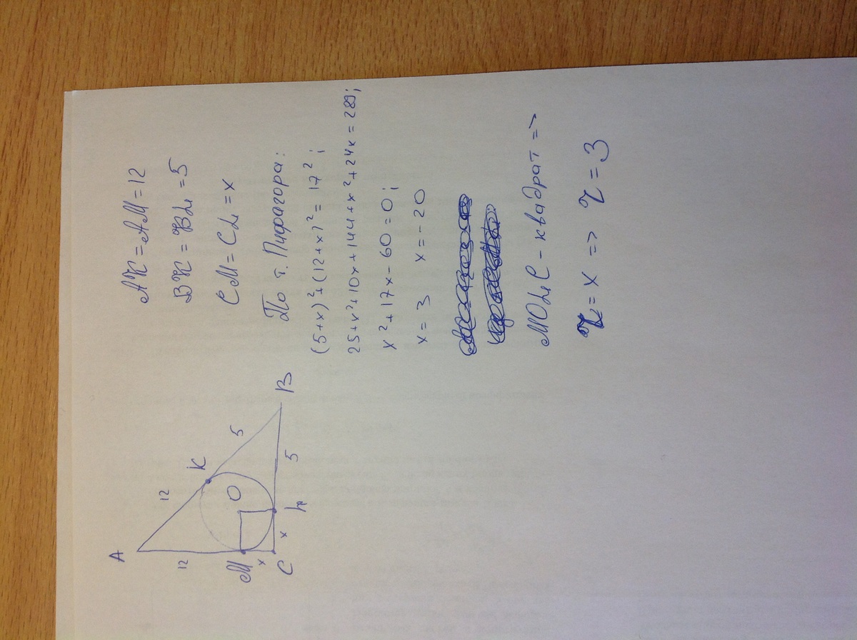 касания гипотенузу на отрезки 12 и 5. Найдите радиус окружности!