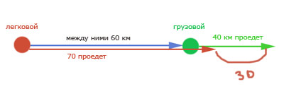 легковой автомобиль движется со скоростью 70км.ч,едет сзади грузовика,грузовик со скор.40км.ч,расстоян