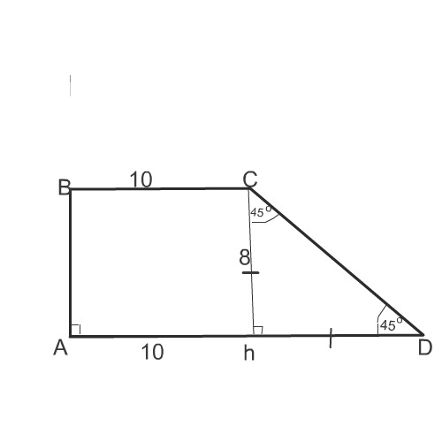 Так как ∠ СDА - 45°, а Δ СhD - прямоугольный, второй острый угол в нем равен 45°, сам треугольник - равнобедренный и высота равна части большего основания. Вторая часть равна 10 см как сторона прямоугольника АВСh, противоположная ВС=10 см
