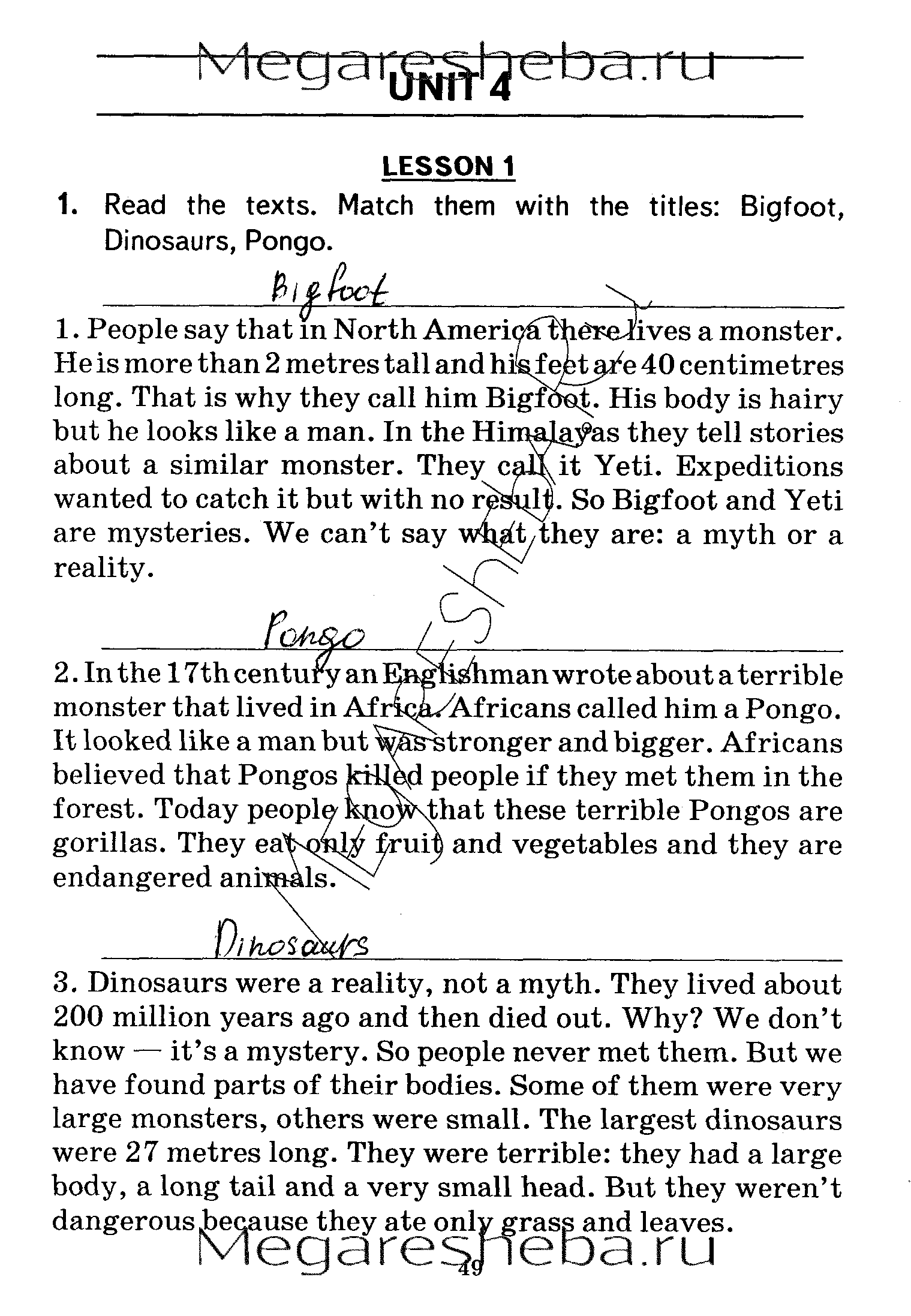 Люди говорят, что в Северной Америке живёт чудовище. Он больше двух метров высотой и его лапища составляют 40 см в длину. Оттого прозвали его снежным человеком. Его тело волосатое, но выгляжин он как человек. В Гималаях рассказывали похожие истории о нём. Они называли его Йете. Экспедиторы хотели поймать его, но безуспешно. Так что снежный человек и йете - загадка природы. Мы не можем сказать, что они существуют: правда это или нет.