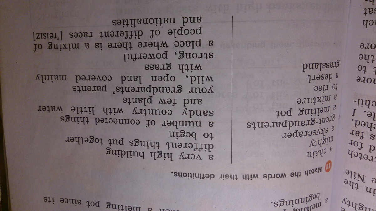1-a number of connected things, 2- strong, powerful, 3-a very high building, 4-your grandparents' parents, 5-a place where there is a mixing of people of different races,6-different things put together, 7-to begin, 8- sandy country, 9-wild, open land covered mainly with grass