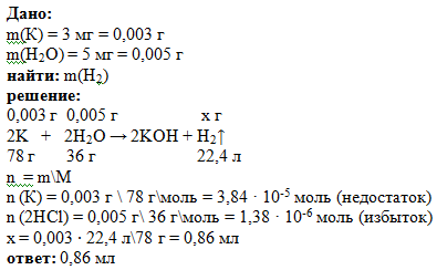 Какой объем ащдорода при нор. усл. можно получитьпри взаймодействии 3 мг. калия с 5 мг. воды?