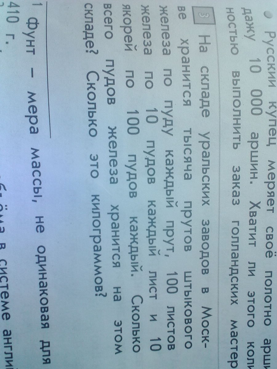 Москве хранится тысяча прудов,штыкового железа по руду каждый прут,100 листов железа по 10 пудов каждый лист и 10 якорей по 100 пудов железа хранится на этом складе?Сколько это килограммов