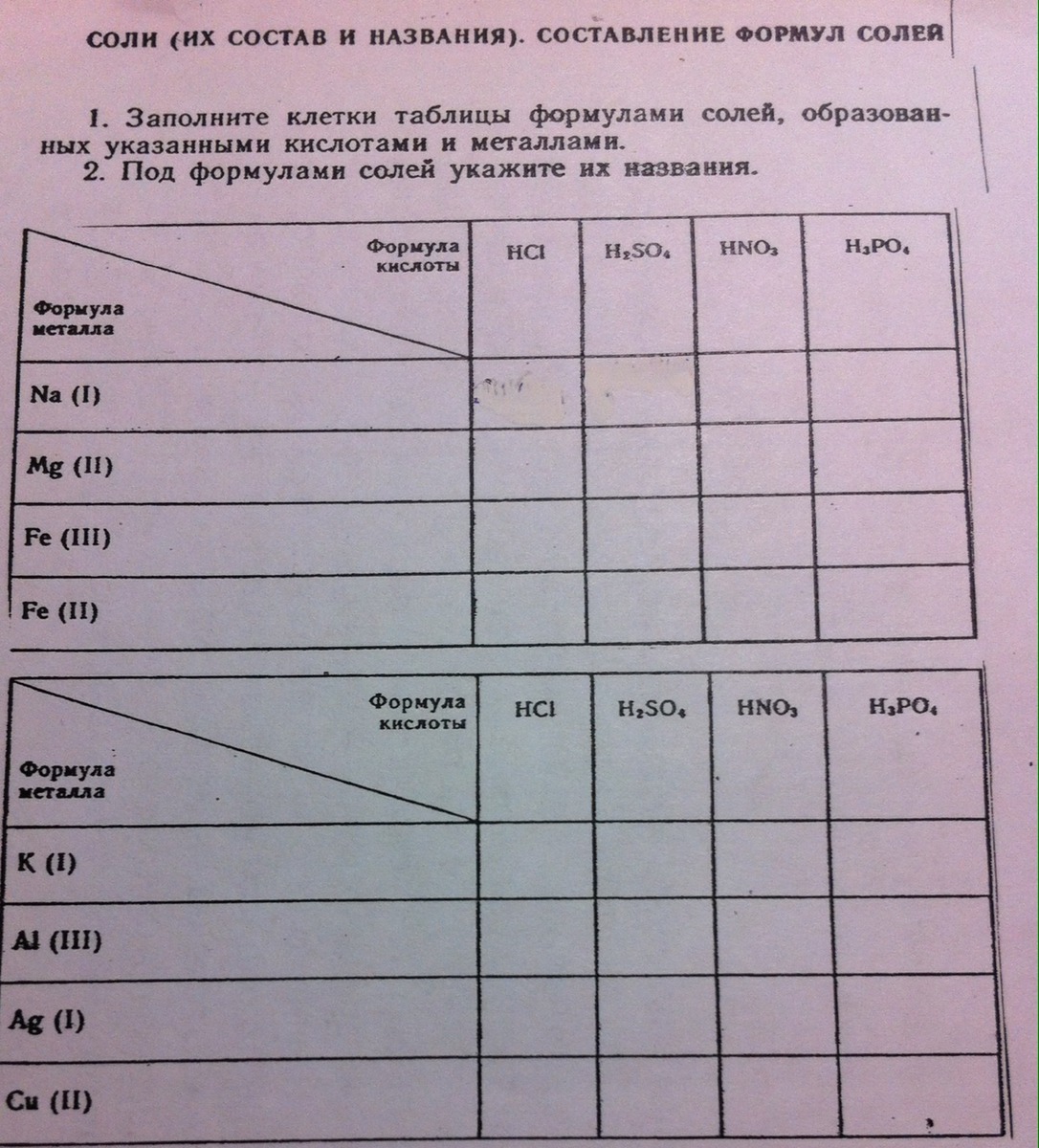 Заполните клетки таблицы формулами солей, образованных указанными кислотами и металлами.