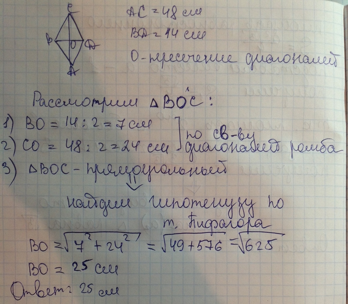 а = √(14/2)² + (48/2)² = √49+576 = 25 (см)