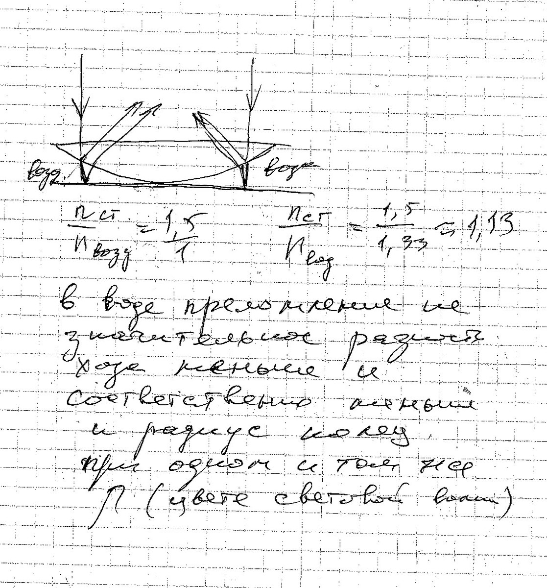 Если пространство между плоским и выпуклым стеклом, где образуются кольца Ньютона, заполнить водой или иной жидкостью, то кольца не исчезнут, но диаметры всех колец уменьшатся Почему?