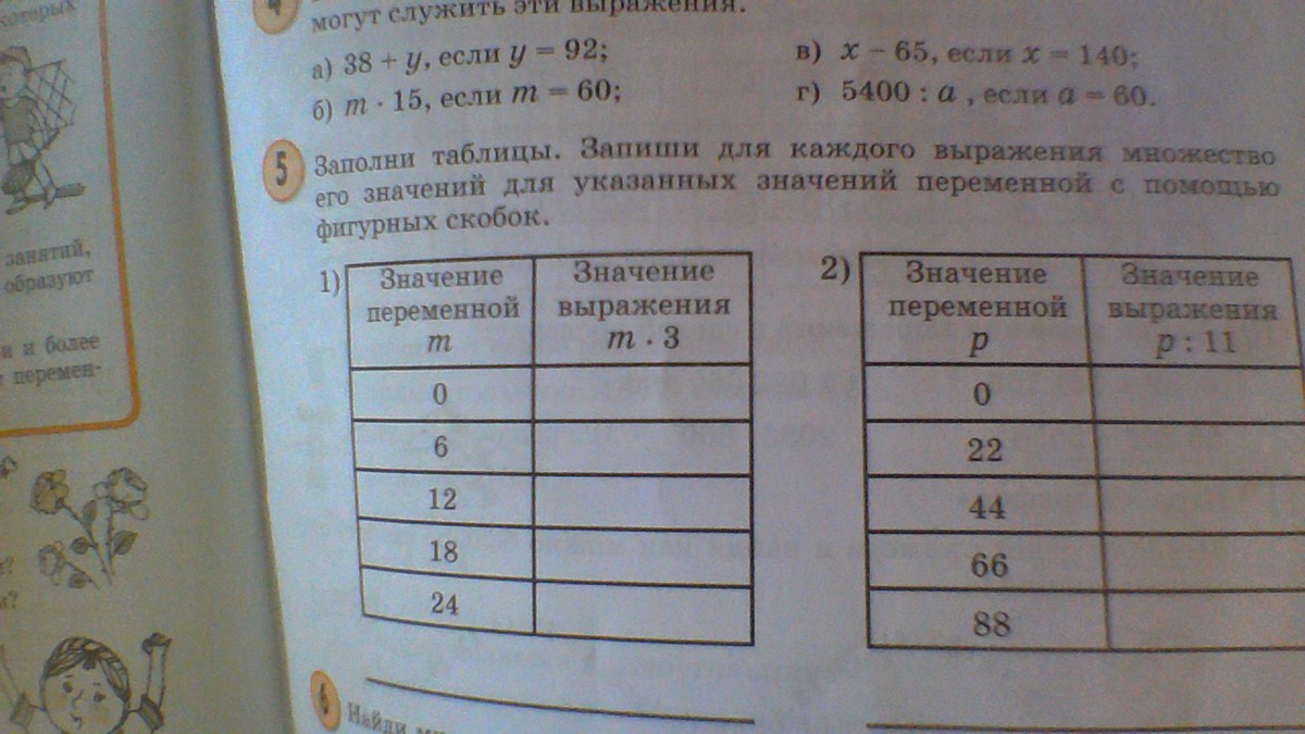 5. Заполни таблицы. Запиши для каждого выражения множество его значений с помощью фигурных скобок.