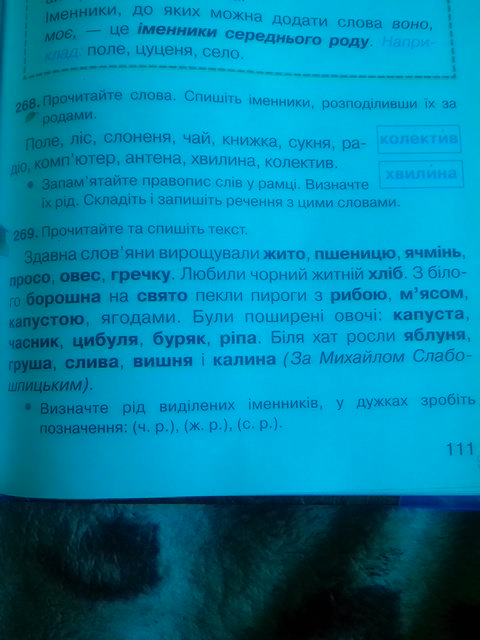 Жито (с.р), пшеницю (ж.р), ячмінь (ч.р),просо (с.р),гречку (ж.р), хліб (ч.р),борошно (с.р), свято (с.р),рибою (ж.р), мясо (с.р), капустою (ж.р),капуста (ж.р), часник (ч.р), цибуля (ж.р), буряк (ч.р), ріпа (ж.р), яблуня (ж.р), груша (ж.р), слива (ж.р), вишня ( ж.р), калина ( ж.р)