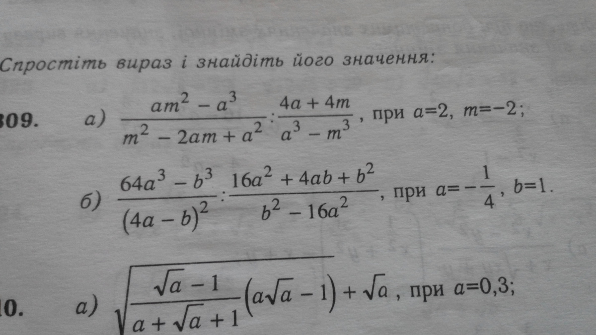 frac{a(a^2+am+m^2)}{4} =  frac{2(4-4+4)}{4} =2 frac{am^2-a^3}{m^2-2am+a^2}: frac{4a+4m}{a^3-m^3}=  frac{a(m^2-a^2)}{(m-a)^2} frac{a^3-m^3}{4(a+m)}= frac{a(m-a)(m+a)(a-m)(a^2+am+m^2)}{4(m-a)^2(a+m)}