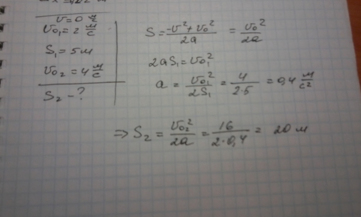 тело с начальной скоростью 2 м/с до полной остановки проходит путь 5м. Это же тело с начальной скоростью 4 м/с, до полной остановки пройдет путь?