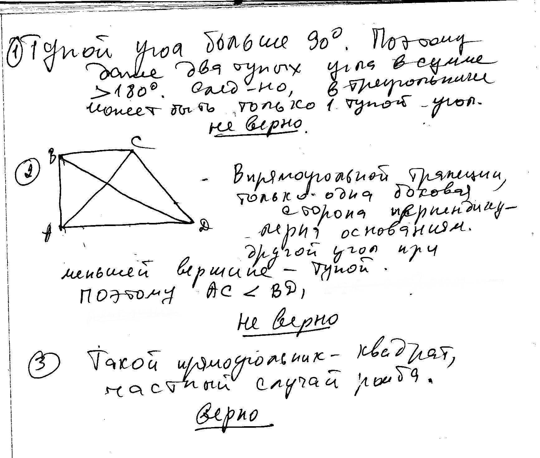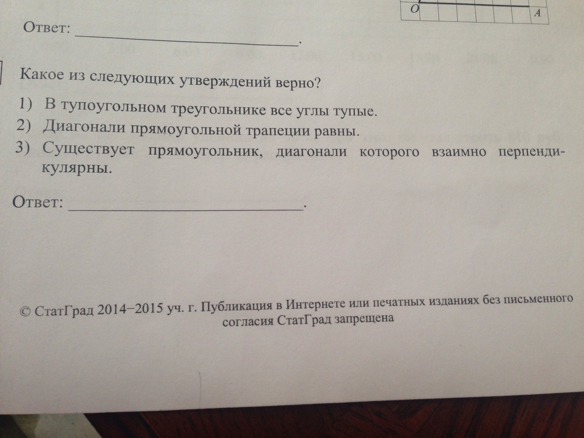 Какое из следующих утверждений верно ? 1)в туаоугольном треугольнике все углы тупые 2) диагонали прямоугольной трапеции равны . 3)сущкствует прямоугольник ,диагональкоторого взаимно перпендикуляры