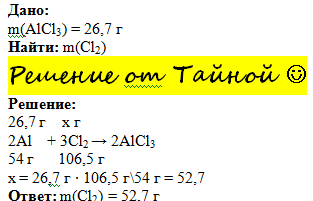 Путем нагревания алюминия в токе хлора было получено 26.7 г хлорида алюминия. Сколько граммов хлора прореагировало?