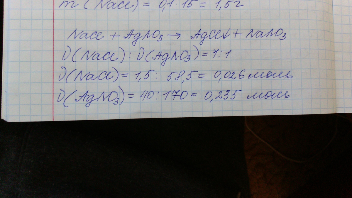n(NaCl)=m/M=1,5/58,5=0,0256 моль