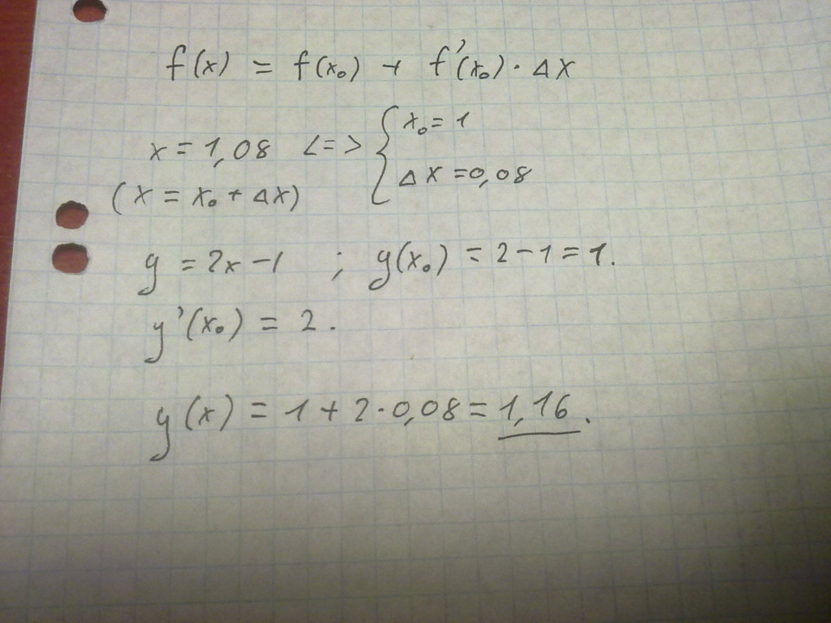 Вычислить приближенно с помощью дифференциала значения заданной функции в указной точке у = 2x - 1 , х = 1,08