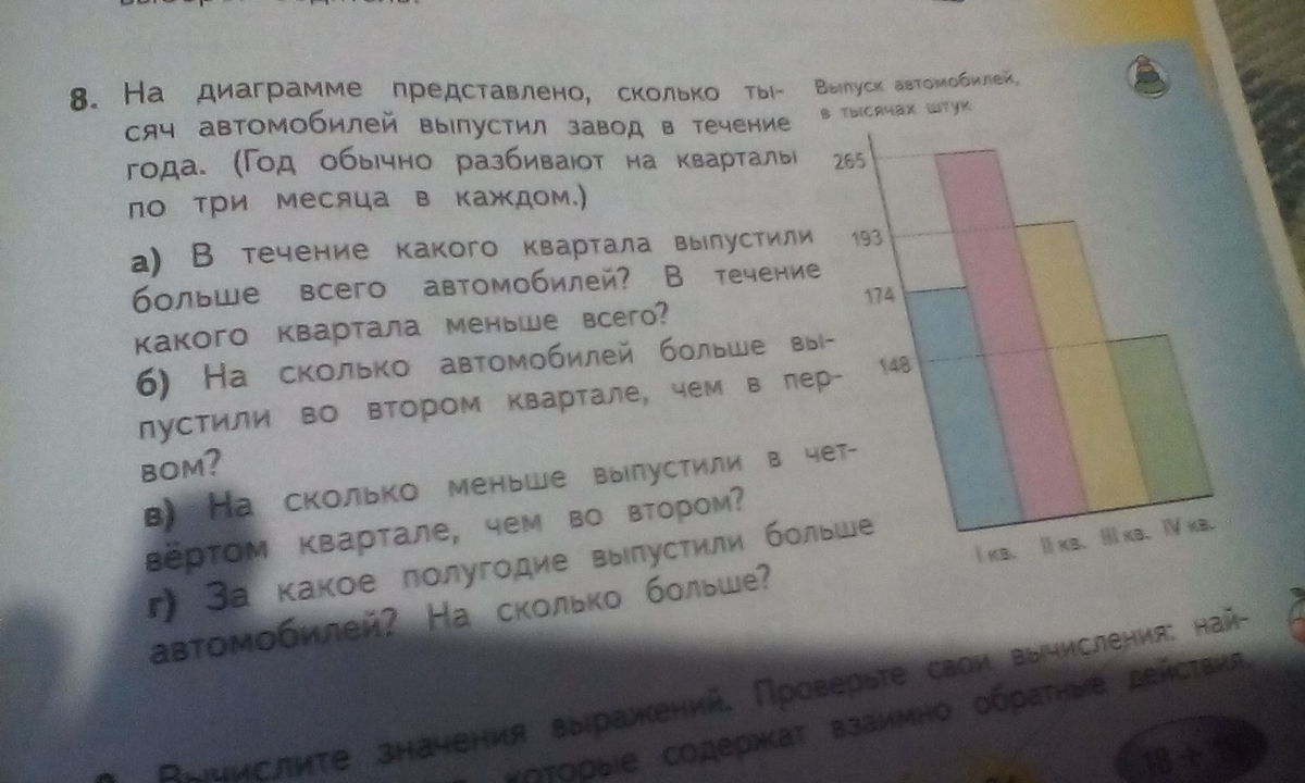 Г) 1)174.000+265.000=439.000; в первом полугоде выпустили 439тыс; 2) 193.000+148.000=341.000, в втором полугоде; 3) 439.000-341.000=98.000, в 1 полугоде выпустили на 98тыс. больше автомобилей