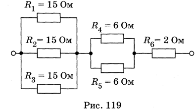 1/R1 + 1/R2 + 1/R3 + 1/R4 +1/R5 + 1/R6 = 1/15 + 1/15 + 1/15 + 1/6 + 1/6 + 1/2 = 0,066 + 0,066 + 0,066 + 0,16 + 0,16 + 0,5 = 1,018 Ом