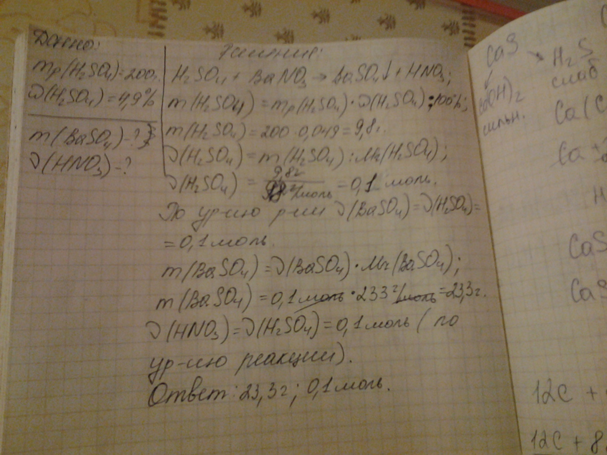 200 грамм 4,9% раствора серной кислоты слили с раствором содержащим нетрат бария определить массу полученного осадка и количества азотной кислоты