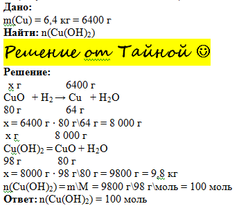 Решите задачу: Какое количество вещества гидроксида меди (II) необходимо разложить, чтобы получить из него столько оксида меди (II), сколько его потребуется для восстановления водородом 6,4 кг меди?