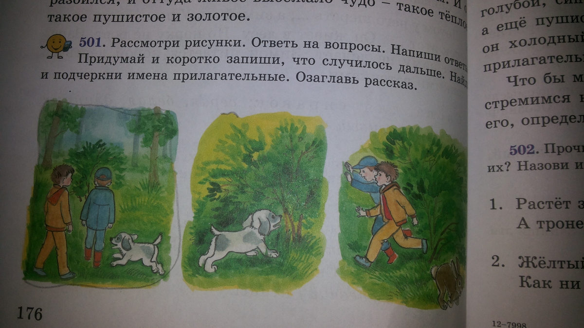 Мальчишки забрели в самую чащу леса. Они шли не торопясь и разговаривали, а когда оглянулись щенка рядом не было.Друзья стали звать его., но в лесу было тихо , только вдалеке пела кукушка. Они продолжали звать. Вдруг из-за куста выскочил Дружок. Он радостно завилял хвостом и затявкал. Дети обрадовались и пошли домой вместе со своим щенком..