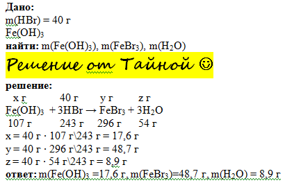Определить m гидроксида железа (III) которое может вступить в реакцию 40г HBr. Определить массы продуктов реакций