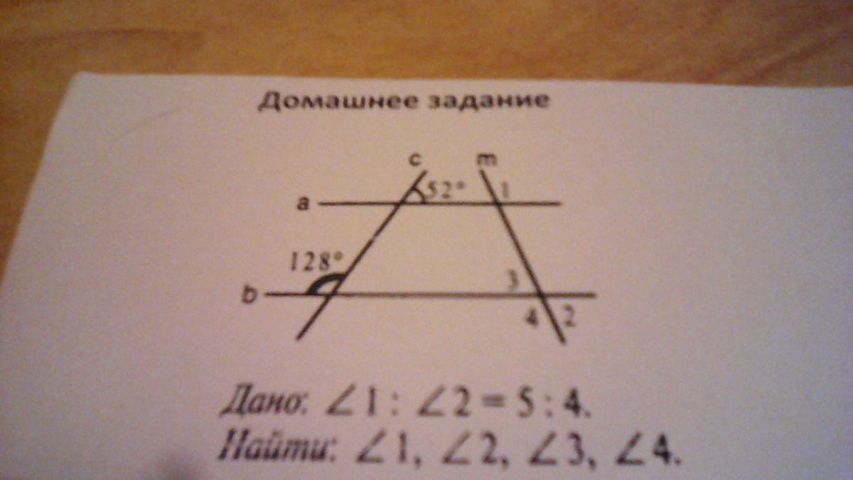 Затем из того, что <1=<4 как накрест лежащие при параллельных прямых a и b и секущей m, имеем соотношение <4:<2 = 5:4. но <2+<4=180 (как смежные). Тогда 5Х+4Х=180°, отсюда Х=20 градусов. Значит <2=4X=80°, a <4=5X=100°. <3=<2=80° как вертикальные <1=<4=100° как накрест лежащие.