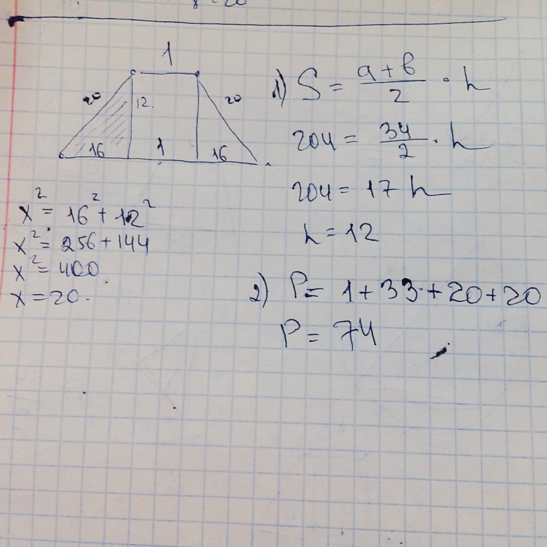 Основания равднобедренной трапеции равны 1 и 33,а ее площадь равна 204. Найдите периметр трапеции.